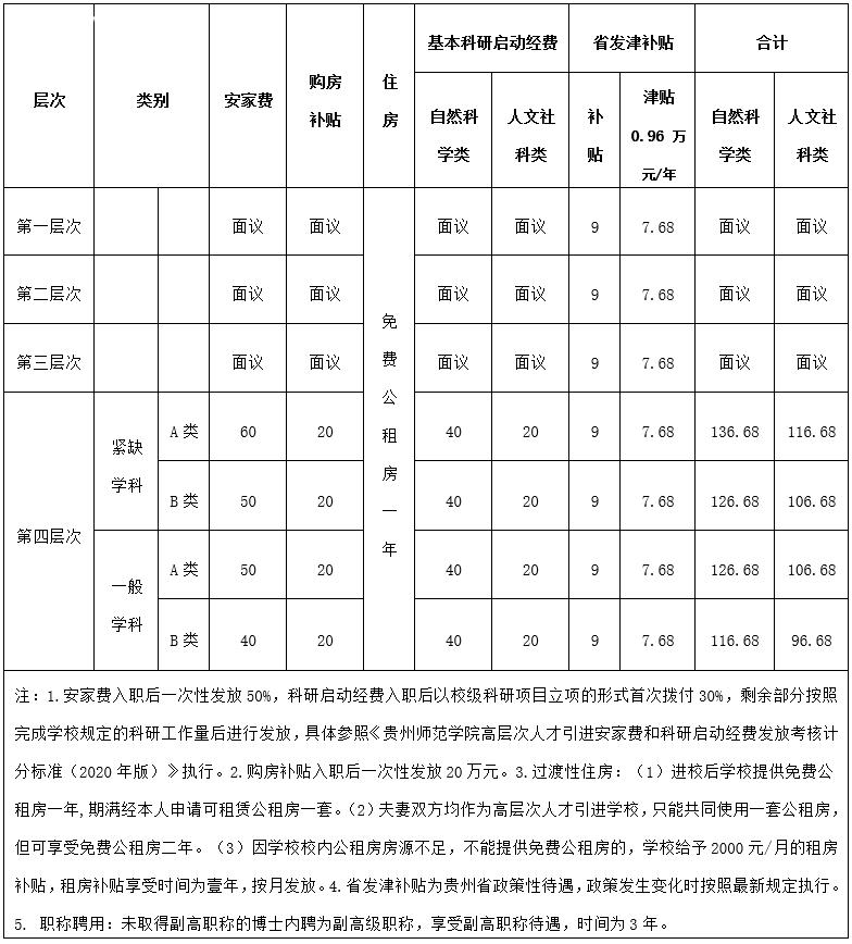 貴州師范學(xué)院2020年高層次人才引進(jìn)待遇一覽表(單位:萬元)