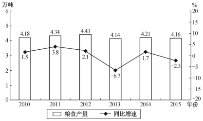 2010~2015年某市糧食產(chǎn)量及其增速